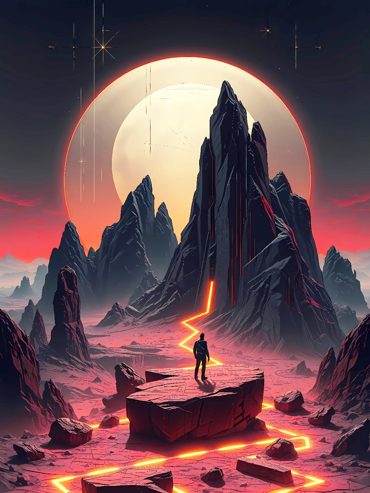 Des aiguilles de roche noire s’élèvent comme les piliers d’une cathédrale que Dieu aurait abandonnée avant d’en achever la voûte. La lumière rouge qui filtre entre elles dessine des vitraux sans verre. Ici, le sacré et le maudit ne font qu’un. Collection Planète Noire – Format JPG – 6000 x 8000 px – 300 ppp. Licence : usage personnel uniquement. Toute utilisation commerciale interdite sans accord écrit.