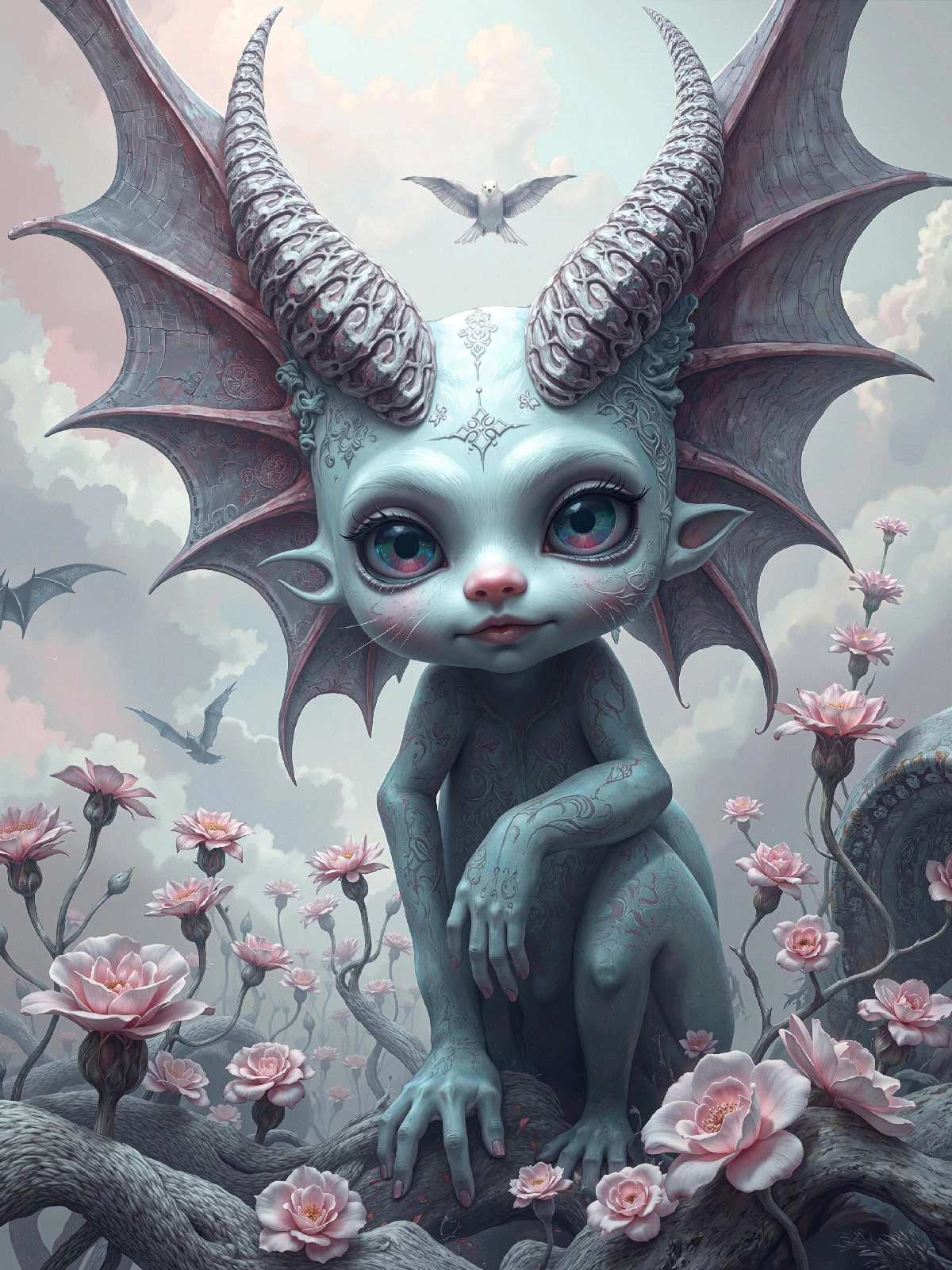 Perchée parmi les fleurs de cerisier roses, cette petite créature aux ailes de chauve-souris défie toutes les catégories célestes. Mi-ange mi-démon, elle a choisi la beauté des pétales plutôt que la grandeur des cieux. Son innocence désarme — c’est peut-être son arme la plus redoutable. Collection Créatures Mystiques – Format JPG – 4500 x 6000 px – 300 ppp. Licence : usage personnel uniquement. Toute utilisation commerciale interdite sans accord écrit.