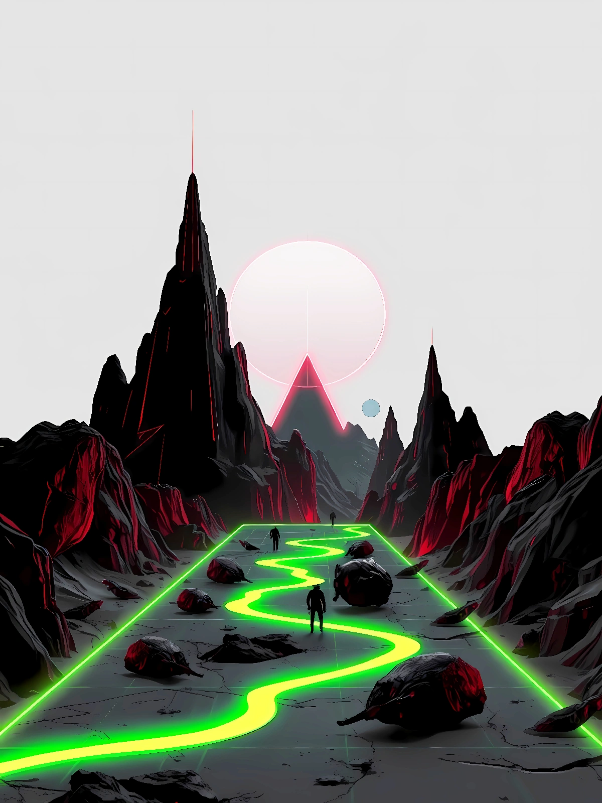 Un flux de lumière verte électrique serpente entre les roches noires comme une rivière venue d’un autre spectre. Cette couleur n’existe pas naturellement sur cette planète — quelque chose ou quelqu’un l’a amenée ici. Le flux ne s’arrête jamais. Il cherche quelque chose. Collection Planète Noire – Format JPG – 6000 x 8000 px – 300 ppp. Licence : usage personnel uniquement. Toute utilisation commerciale interdite sans accord écrit.