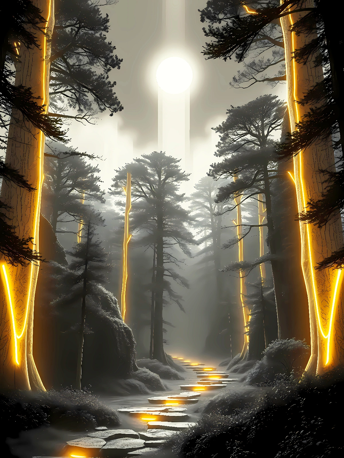 Dans la forêt luminescente, les arbres de pierre émettent une lumière dorée qui n’éclaire que ce qu’elle veut bien montrer. Les ombres ici ne suivent pas la lumière — elles la précèdent. Entrer dans cette forêt, c’est accepter de voir le monde différemment. Collection Planète Noire – Format JPG – 6000 x 8000 px – 300 ppp. Licence : usage personnel uniquement. Toute utilisation commerciale interdite sans accord écrit.