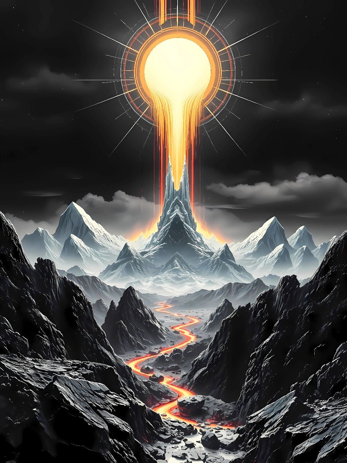 Un soleil rouge et aveuglant explose au sommet d’une pyramide de roche noire, baignant un paysage de montagne dans une lumière apocalyptique. Les rivières de lave qui descendent des flancs témoignent d’une énergie que rien ne peut contenir. La fusion est totale, irréversible. Collection Planète Noire – Format JPG – 6000 x 8000 px – 300 ppp. Licence : usage personnel uniquement. Toute utilisation commerciale interdite sans accord écrit.