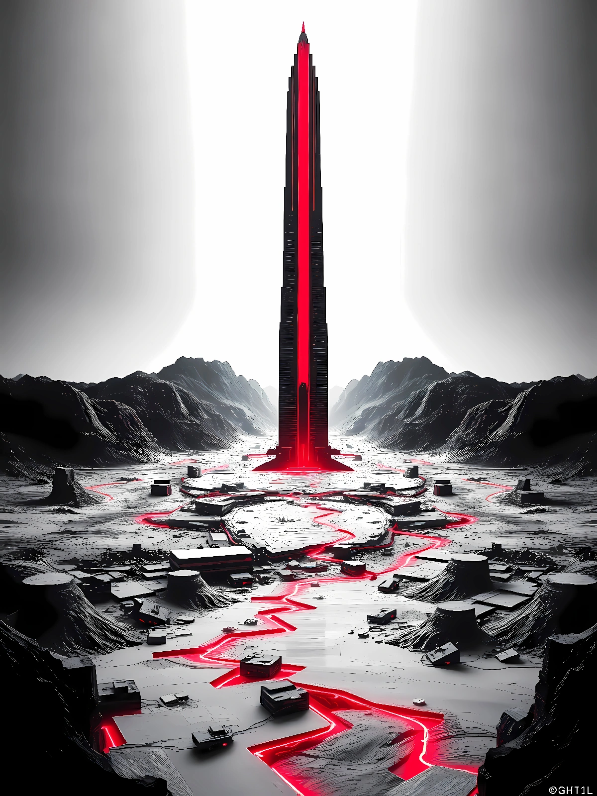 Le monolithe sacré se dresse seul dans la plaine de cendres, ses flancs couverts de symboles que le vent efface et que la planète réinscrit chaque nuit. Il n’a pas été construit — il a toujours été là. C’est le reste du monde qui est apparu autour de lui. Collection Planète Noire – Format JPG – 6000 x 8000 px – 300 ppp. Licence : usage personnel uniquement. Toute utilisation commerciale interdite sans accord écrit.