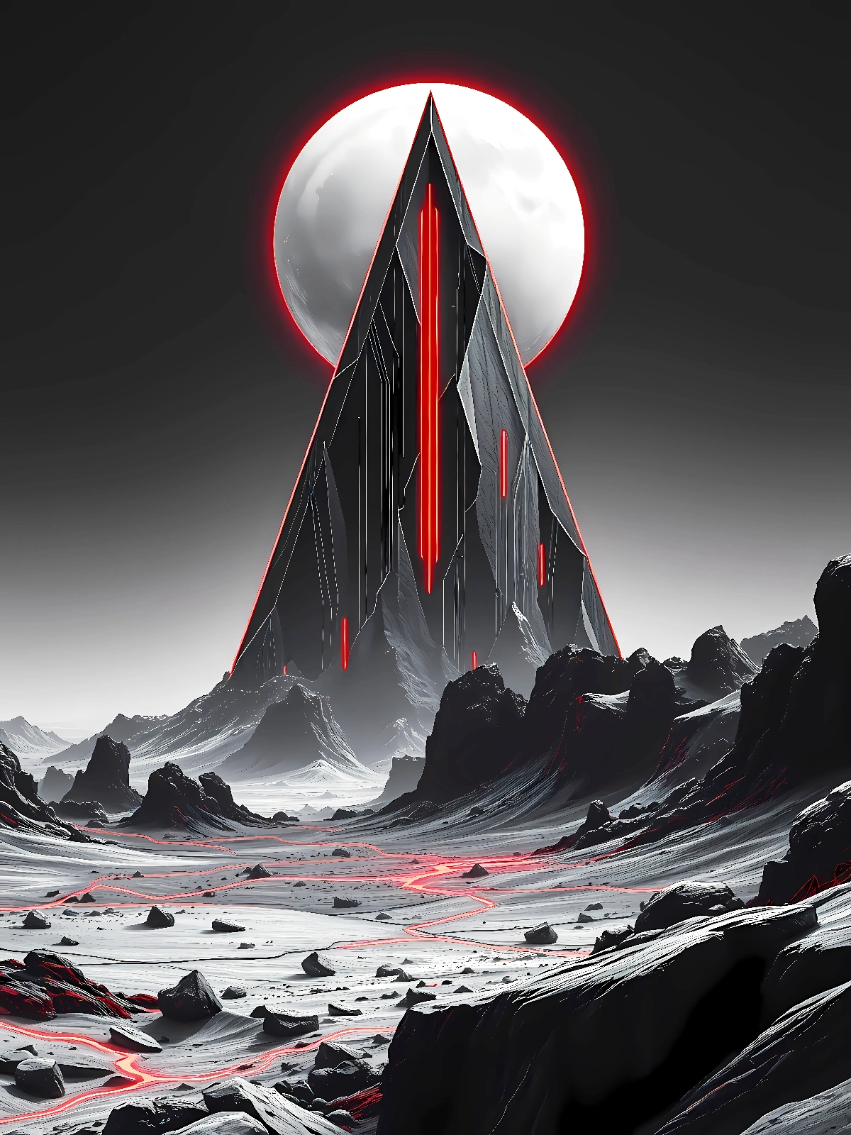 Un unique pic noir s’élève vers une lune blanche dans un ciel d’encre, leur dialogue silencieux traversant des millénaires de solitude partagée. La lave qui coule à sa base est une larme — de la planète ou de la lune, nul ne sait. Ce pic est le dernier témoin de quelque chose d’oublié. Collection Planète Noire – Format JPG – 6000 x 8000 px – 300 ppp. Licence : usage personnel uniquement. Toute utilisation commerciale interdite sans accord écrit.
