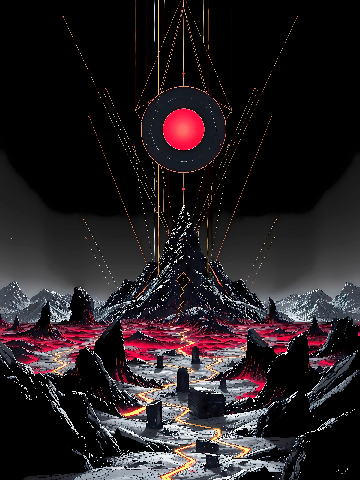Au point Zéro, là où toutes les coordonnées s’annulent, la terre elle-même semble hésiter entre l’existence et le vide. Des strates de roche noire et rouge s’empilent en couches géologiques impossibles. C’est ici que commence tout et que finit tout. Collection Planète Noire – Format JPG – 6000 x 8000 px – 300 ppp. Licence : usage personnel uniquement. Toute utilisation commerciale interdite sans accord écrit.