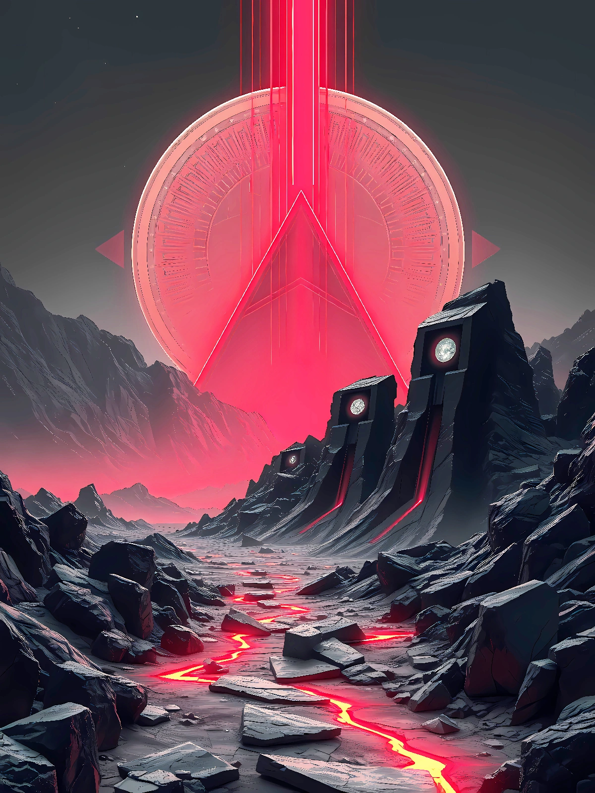 Dans la veille cosmique, un œil de lumière rouge observe depuis le centre d’un cercle géométrique parfait, entouré de montagnes qui lui servent de paupières. Cette planète ne dort jamais. Elle attend. Ce qu’elle attend, personne ne le sait encore. Collection Planète Noire – Format JPG – 6000 x 8000 px – 300 ppp. Licence : usage personnel uniquement. Toute utilisation commerciale interdite sans accord écrit.